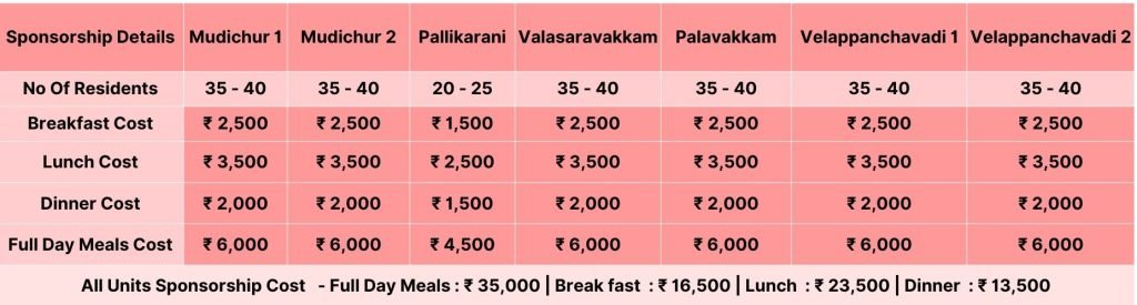 You can sponsor the food of any of our homes as per the details given below. You can also donate any other amount as you can.