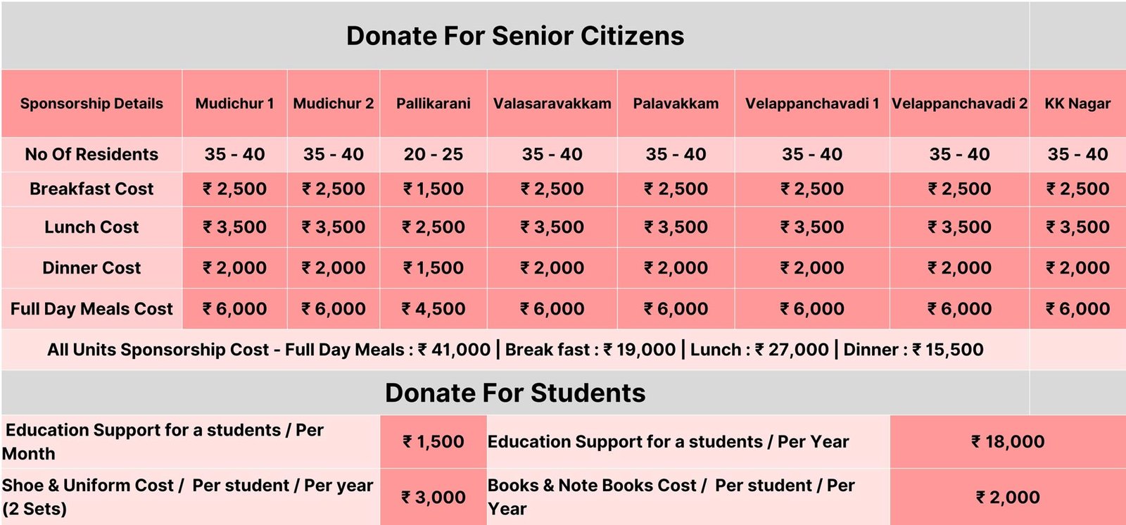 You can also be a part of the noble mission taken up by  Akshaya Trust. Your small contribution will make a huge differnce in the lives of 300 deserving senior citizens. Their blessings will bring many good things in your life.