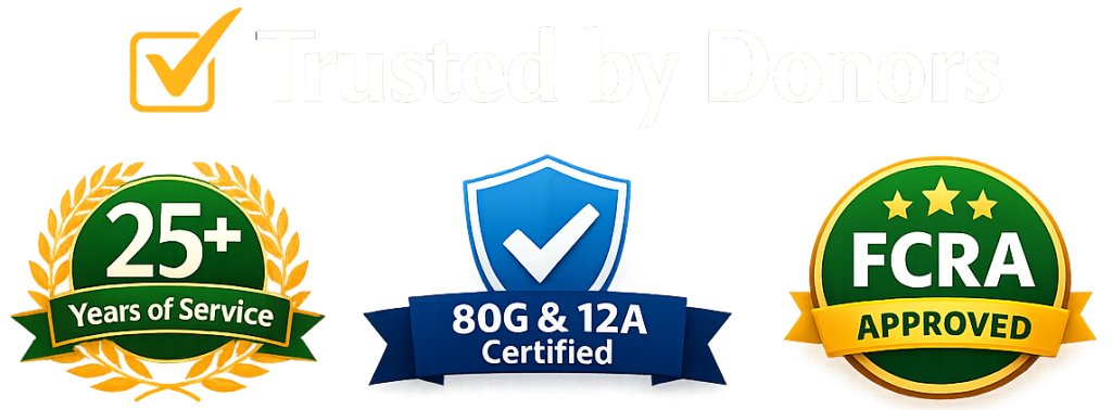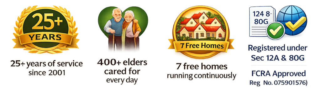 ₹1,500 provides complete food and care for one elder for a day ₹18,000 supports one child’s education for a full year ₹7,500 ensures one elder lives with dignity for a month